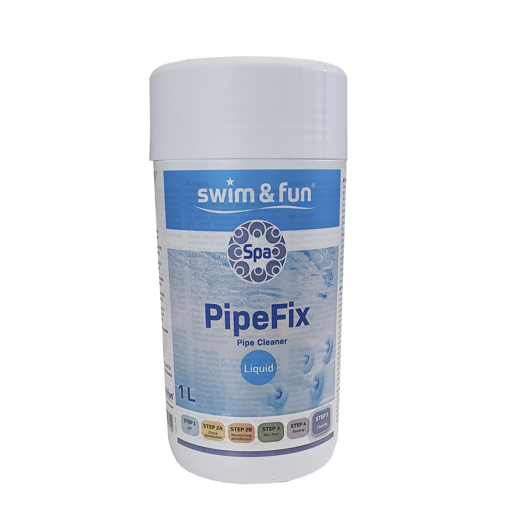 Käyttöohje: Allas desinfioidaan normaaliin tapaan ennen käsittelyä. Altaan vedenpinnan tulee olla vähintään 5 cm suuttimien yläpuolella. Ravista pulloa hyvin. Lisää oikea määrä PipeFix -puhdistusainetta vielä täyteen altaaseen ja anna kiertovesipumpun käydä. Ota suodatin mahdollisuuksien mukaan pois ennen puhdistusta. Kiertovesipumppu voidaan sammuttaa 30 minuutin kuluttua, jonka jälkeen allas tyhjennetään. Täytä allas sen jälkeen kokonaan puhtaalla vedellä.